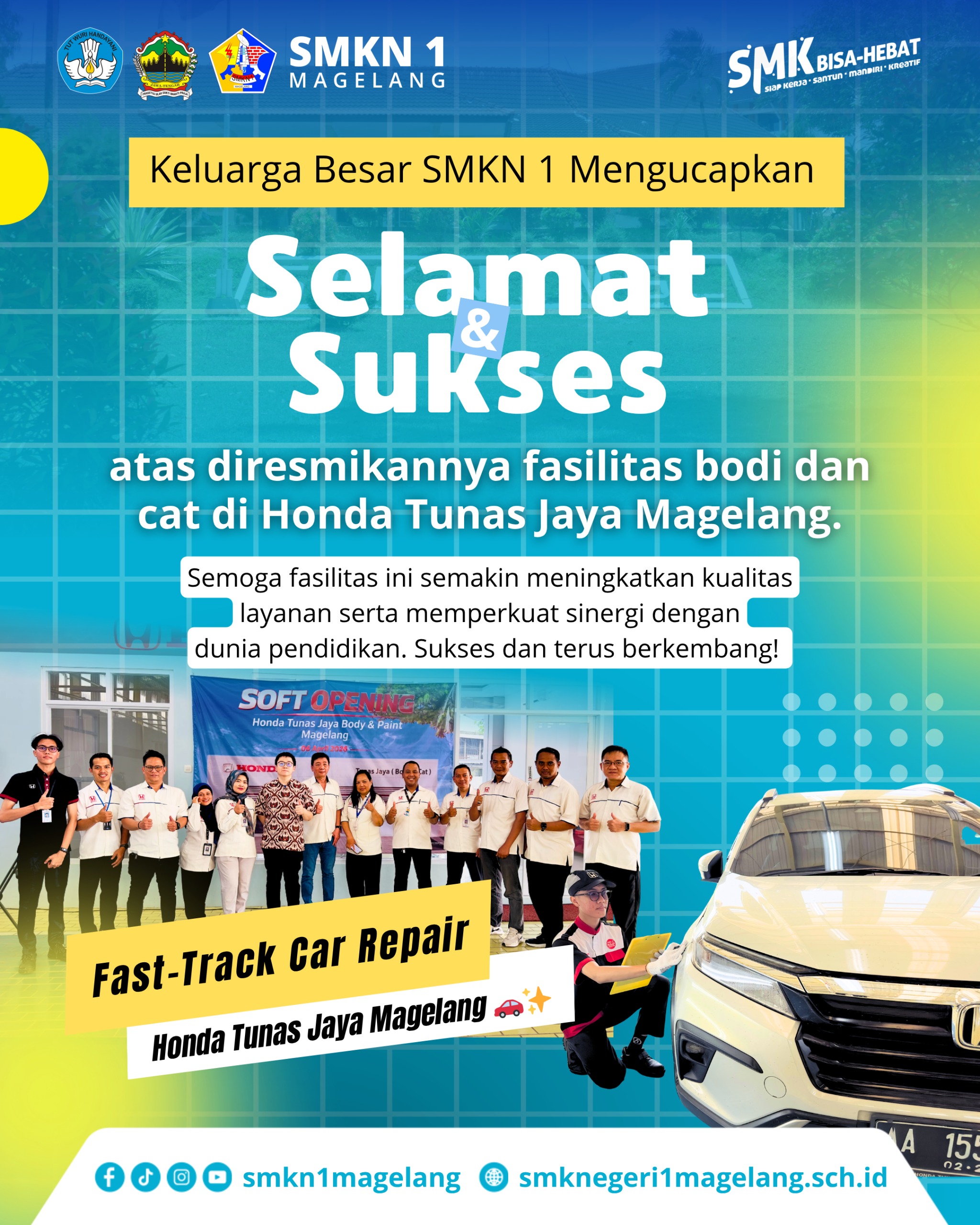 Kabar menggembirakan datang dari kolaborasi dunia pendidikan dan industri otomotif. Keluarga besar SMKN 1 Magelang menyampaikan ucapan selamat dan sukses atas diresmikannya fasilitas bodi dan cat (body & paint) di Honda Tunas Jaya Magelang.