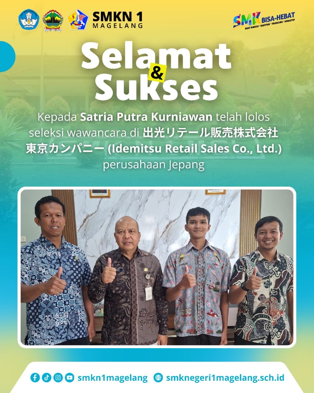 Magelang – Kabar membanggakan kembali datang dari keluarga besar SMKN 1 Magelang. Salah satu siswa terbaiknya, Satria Putra Kurniawan, berhasil lolos seleksi wawancara di perusahaan ternama Jepang, 出光リテール販売株式会社 東京カンパニー (Idemitsu Retail Sales Co., Ltd.). Prestasi ini menjadi bukti nyata bahwa lulusan SMK mampu bersaing di kancah internasional dan membawa nama baik sekolah hingga mancanegara.