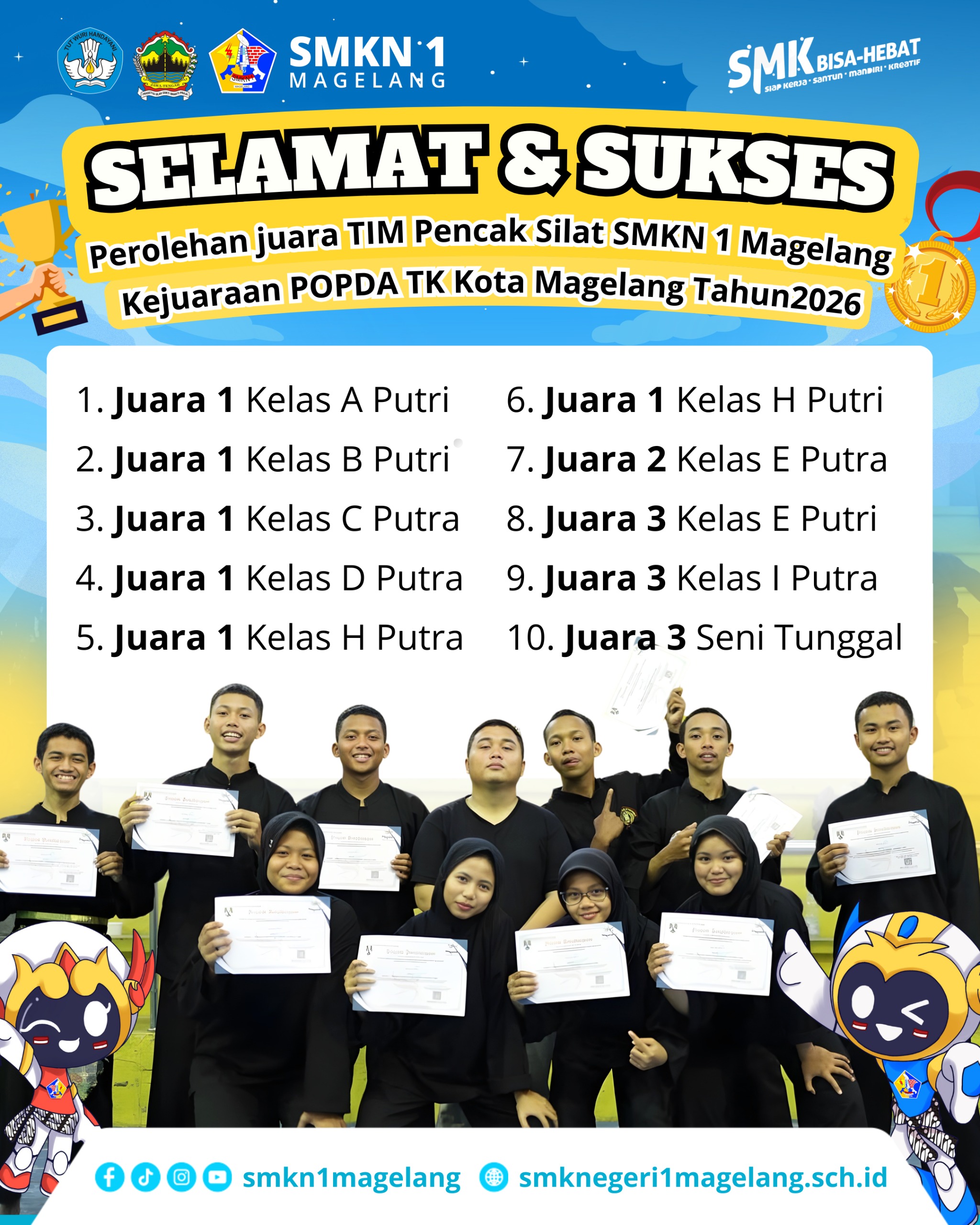 Keberhasilan ini menjadi bukti nyata bahwa SMKN 1 Magelang tidak hanya unggul dalam bidang akademik dan kejuruan, tetapi juga berprestasi gemilang di bidang olahraga dan seni bela diri tradisional.